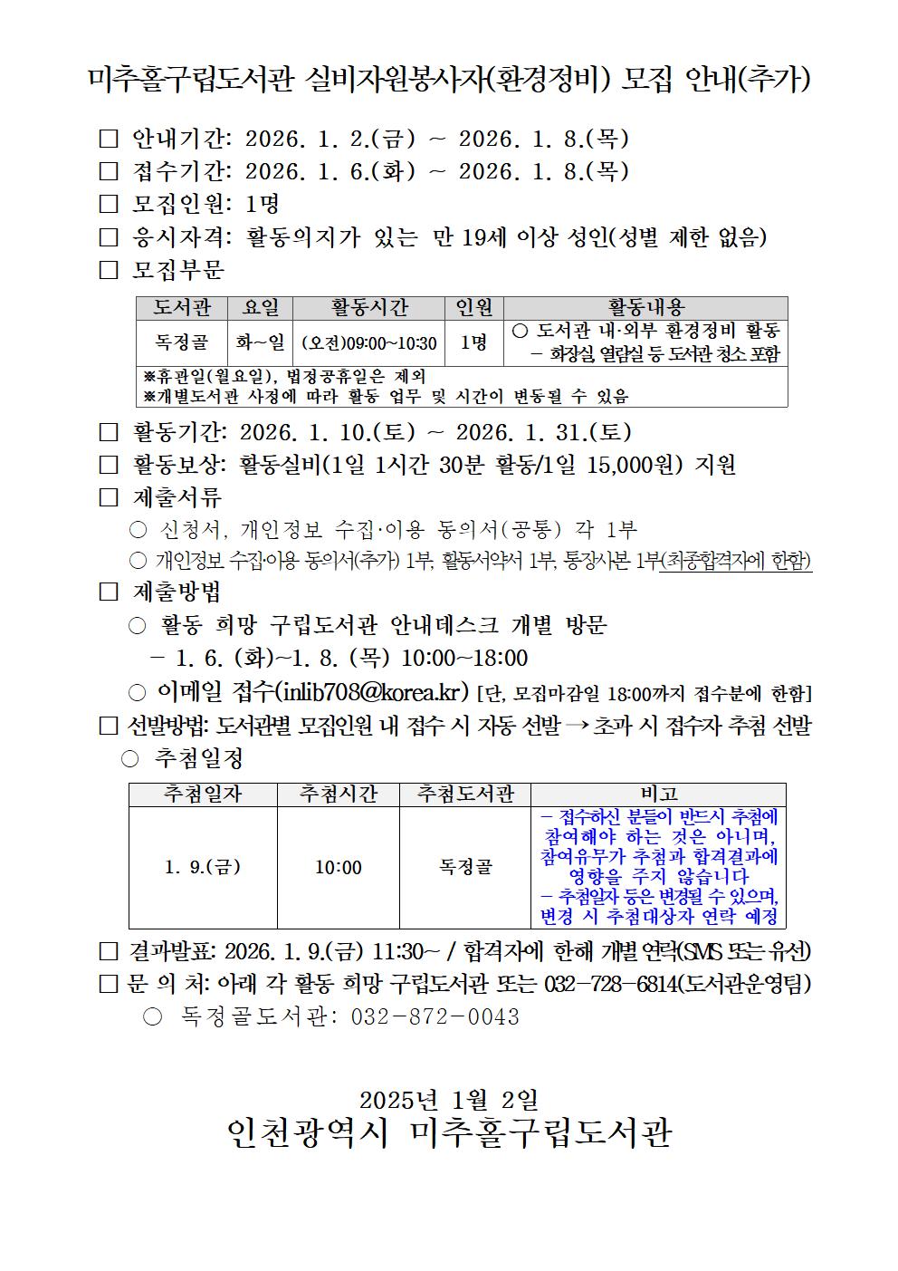 독정골도서관 실비자원봉사(환경정비) 추가 모집 안내