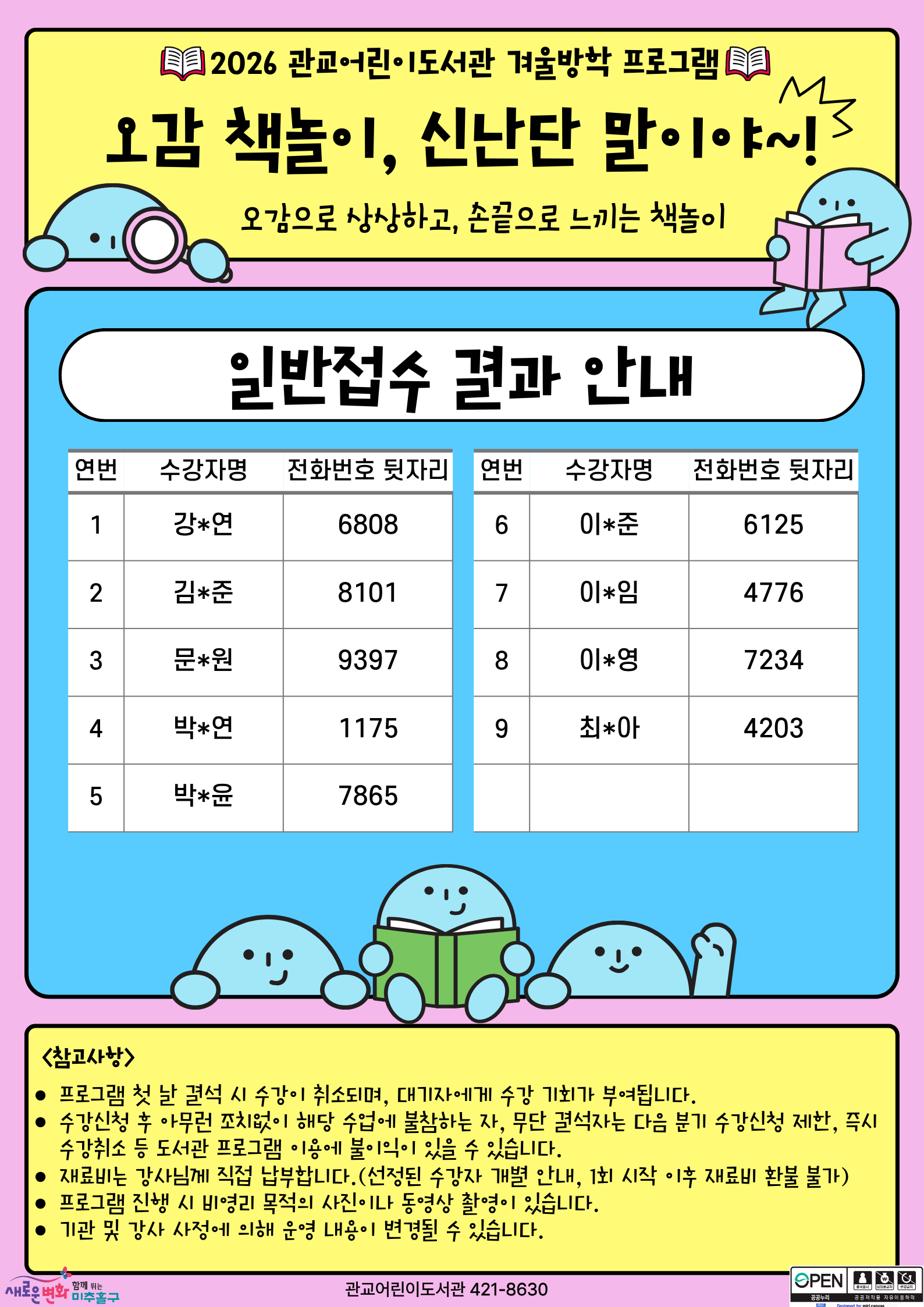 - 수강신청 후 아무런 조치없이 해당 수업에 불참하는자는 다음 분기 수강신청 제한·즉시 수강취소 등 도서관 프로그램 이용에 불이익이 있을 수 있습니다.