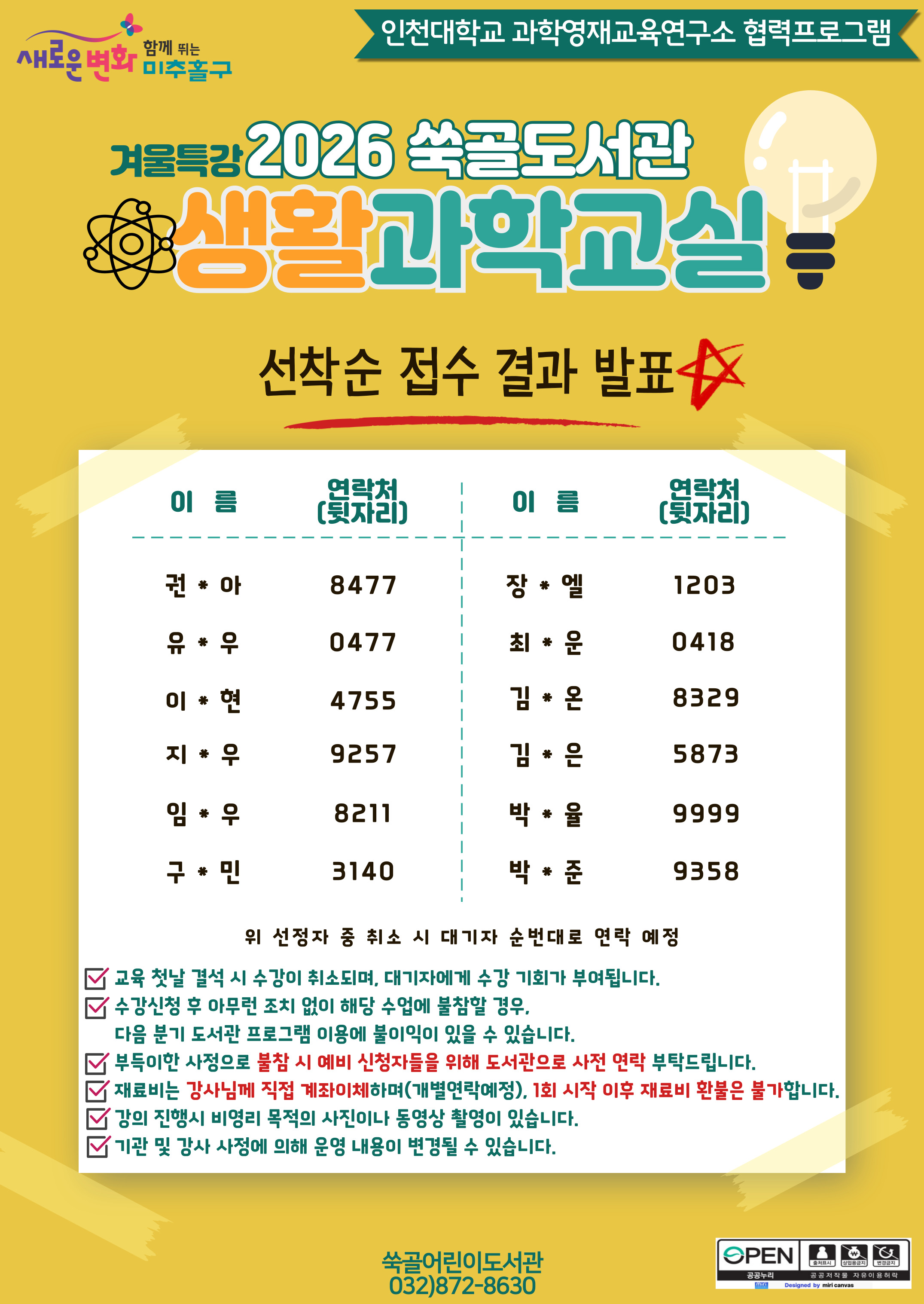 <2026 겨울특강 생활과학교실> 선착순 접수 결과 안내드립니다.