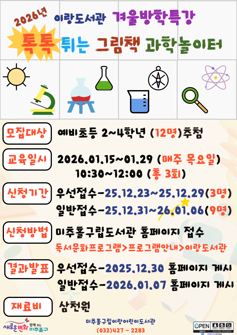 [일반접수] 2026년 이랑도서관 겨울방학특강 프로그램 <톡톡 튀는 그림책 과학놀이터> |