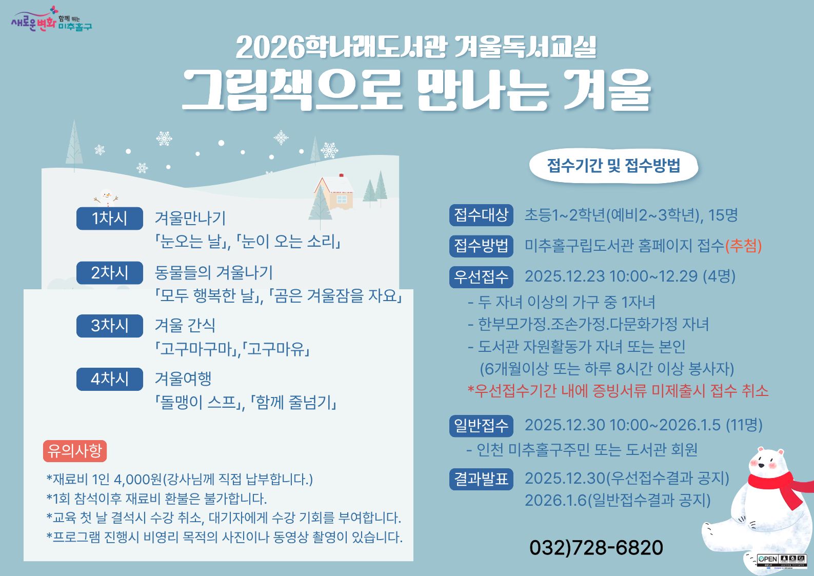 - 결과발표: 2026. 1. 6(화) 15:00 미추홀구립도서관 홈페이지 게시